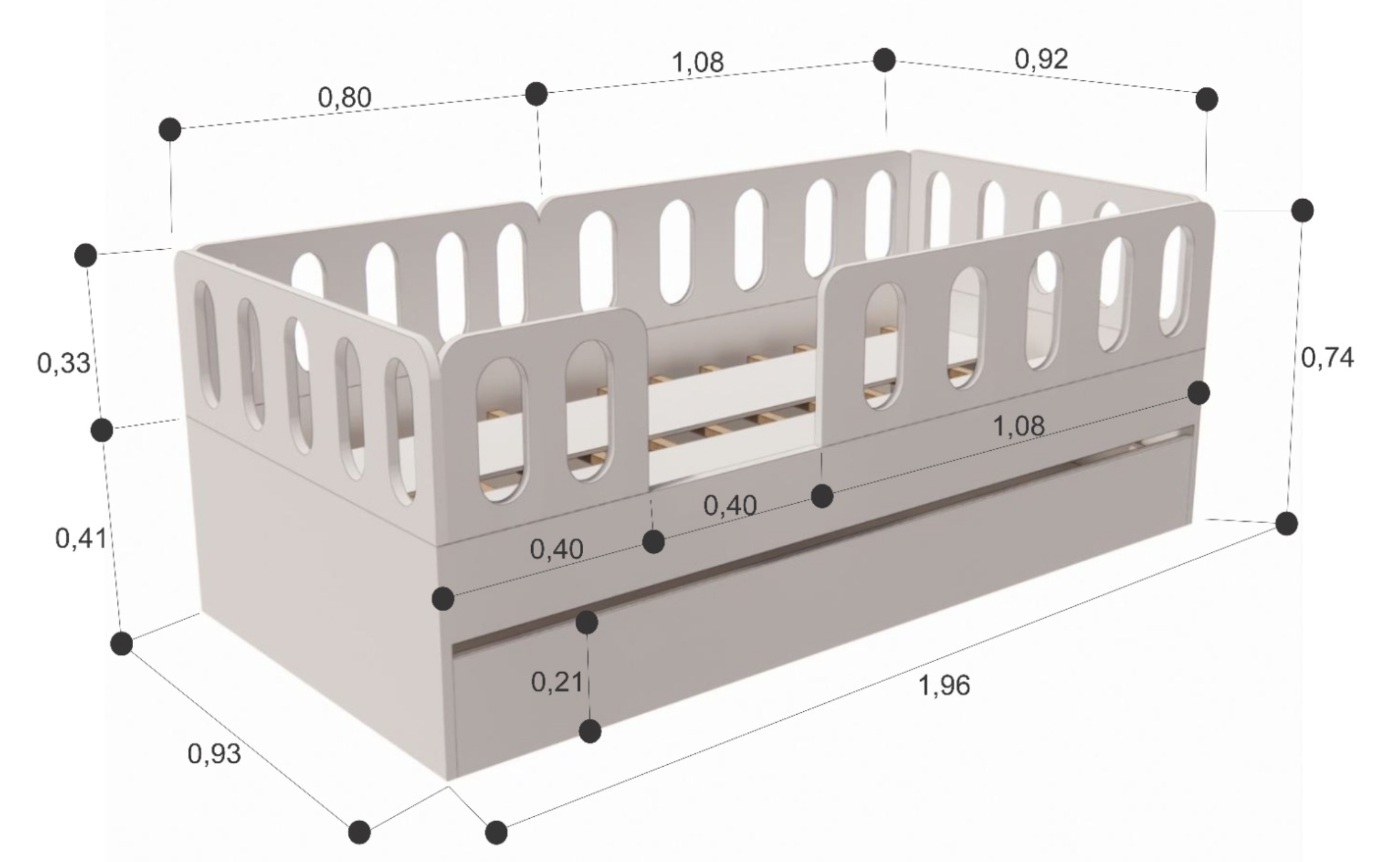 • Medidas do móvel: 1,96 m (C) × 0,93 m (L) × 0,74 m (A — até o topo da grade)
